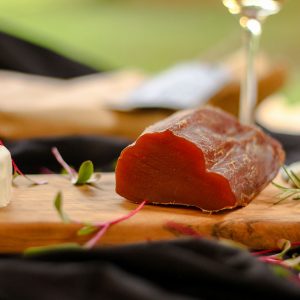 Svaki komad ćureće pršute je jedinstven i neponovljiv i zato gramaža varira, a težina pakovanja se kreće od oko 300g do oko 650g. Manji komadi su dimljeniji i suvlji, dok su veći komadi mekši i nešto manje slani. Ukoliko želiš, možemo ti doneti u komadu ili iseckanu, ali je važno da znaš da je tada njen rok trajanja kraći, svega nekoliko dana.Ćureća pršuta – oko 400g